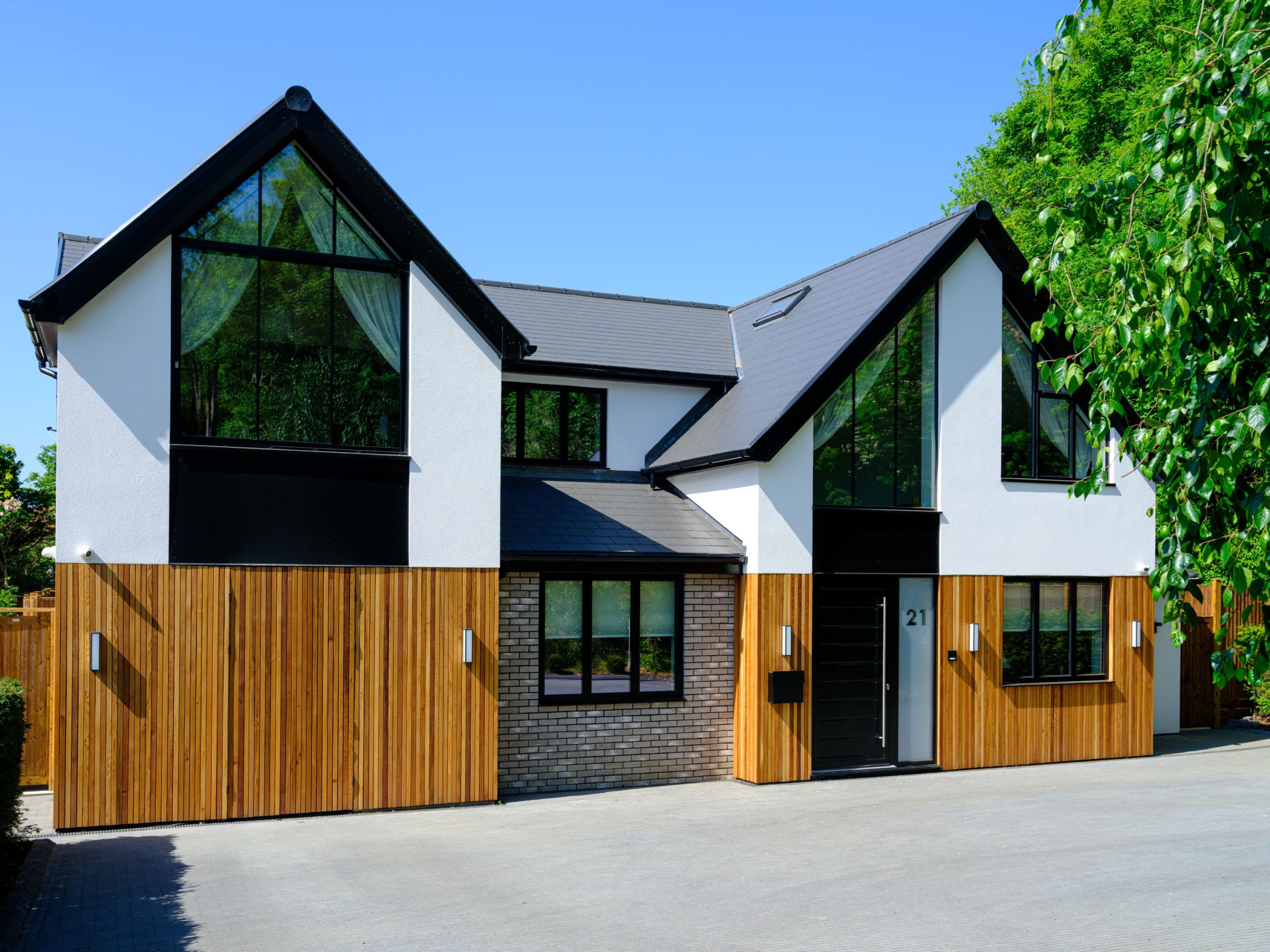 Tudor Design and Build completely transformed this detached family home in Harpenden, turning it into a true standout property. The team reconfigured the entire internal layout, keeping only the kitchen in its original position. They also added ground and first-floor extensions and replaced the roof with a striking new design featuring glass-gabled bedrooms and dramatic vaulted ceilings. To improve flow throughout the home, the staircase was repositioned, and a state-of-the-art cinema room was introduced on the ground floor. In addition, the team designed and installed bespoke joinery—from floating shelves and wall panelling to made-to-measure fitted wardrobes—adding style and functionality at every turn. Outside, Western Red Cedar cladding now wraps smoothly from front to rear, giving the property a warm, contemporary character that enhances its bold architectural form.
